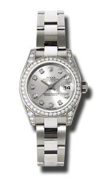 Model: 179159-SIDO - CASE = [Material:18kt White Gold With Diamonds], [Case Diameter:26], [Bezel:Diamonds and 18k White Gold], [Case Back:Solid], [Water Resistant:100 Meters - 330 Feet], [Crystal:Sapphire], DIAL = [Color:Silver Diamond], MOVEMENT = [Type:Automatic Self Winding], [Crown:Screw Down], BAND = [Clasp:Oysterlock Clasp], [Type:18kt White Gold Oyster], (Usually ships in 1 to 2 weeks.)