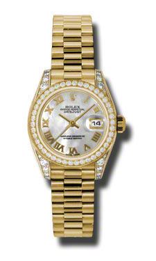 Model: 179158-MOPRP - CASE = [Material:18k Yellow Gold Diamond Encrusted], [Case Diameter:26], [Bezel:18k Yellow Gold Diamond], [Case Back:Solid], [Water Resistant:100 Meters - 330 Feet], [Crystal:Sapphire], DIAL = [Color:Mother of Pearl Roman Numeral], MOVEMENT = [Type:Automatic Self Winding], [Crown:Screw Down], BAND = [Clasp:Concealed Crown], [Type:18kt Yellow Gold President], (Usually ships in 1 to 2 weeks.)