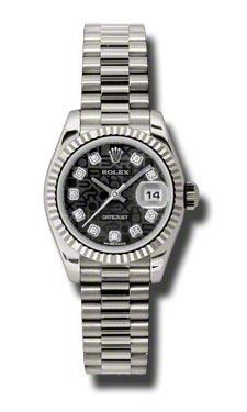 Model: 179179-BKJDJ - CASE = [Material:18kt White Gold], [Case Diameter:26], [Bezel:Fluted], [Case Back:Solid], [Water Resistant:100 Meters - 330 Feet], [Crystal:Sapphire], DIAL = [Color:Black Jubilee Diamond], MOVEMENT = [Type:Automatic Self Winding], [Crown:Screw Down], BAND = [Clasp:Concealed Crown], [Type:18kt White Gold Jubilee], (Usually ships in 1 to 2 weeks.)