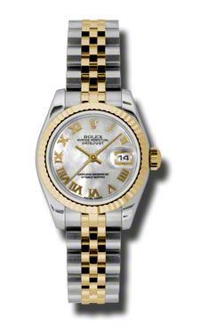 Model: 179173-MOPRJ - CASE = [Material:Stainless Steel], [Case Diameter:26], [Bezel:Fixed Fluted 18kt Yellow Gold], [Case Back:Solid], [Water Resistant:100 Meters - 330 Feet], [Crystal:Scratch Resistant Sapphire], DIAL = [Color:Mother of Pearl Roman Numeral], MOVEMENT = [Type:Automatic Self Winding], [Crown:Screw Down], BAND = [Clasp:Concealed Crown], [Type:18kt Yellow Gold and Stainless Steel Jubilee], (Usually ships in 1 to 2 weeks.)