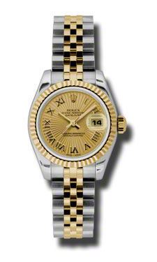 Model: 179173-CHSRJ - CASE = [Material:Stainless Steel], [Case Diameter:26], [Bezel:Fluted 18kt Yellow Gold], [Water Resistant:100 Meters - 330 Feet], [Crystal:Scratch Resistant Sapphire], DIAL = [Color:Champagne Sunburst Roman Numeral], MOVEMENT = [Type:Automatic Self Winding], [Crown:Screw Down], BAND = [Clasp:Hidden Deployant], [Type:18kt Yellow Gold and Stainless Steel Jubilee], (Usually ships in 1 to 2 weeks.)