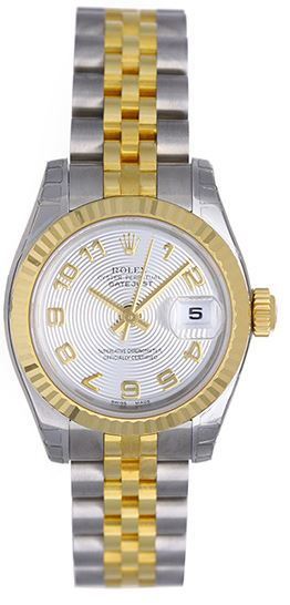 Model: 179173-SICAJ - CASE = [Material:Stainless Steel], [Case Diameter:26], [Bezel:Fixed Fluted], [Water Resistant:100 Meters - 330 Feet], [Crystal:Sapphire], DIAL = [Color:Silver Concentric Arabic], MOVEMENT = [Type:31 Jewels Automatic Self Winding], BAND = [Clasp:Hidden Deployant], [Type:18kt Yellow Gold and Stainless Steel Jubilee], (Usually ships in 1 to 2 weeks.)