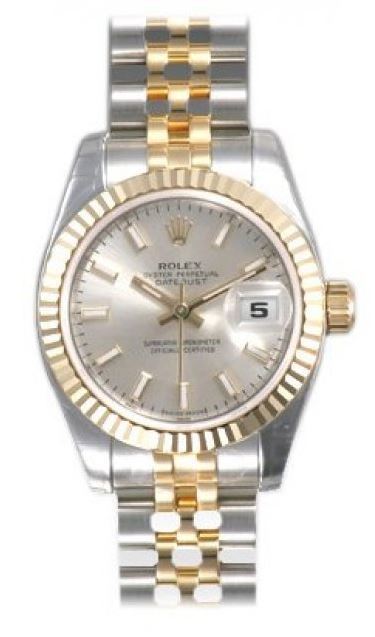 Model: 179173-SISJ - CASE = [Material:Stainless Steel], [Case Diameter:26], [Bezel:Fixed Fluted], [Water Resistant:100 Meters - 330 Feet], [Crystal:Sapphire], DIAL = [Color:Silver Luminous Stick], MOVEMENT = [Type:31 Jewels Automatic Self Winding], BAND = [Clasp:Hidden Deployant], [Type:18kt Yellow Gold and Stainless Steel Jubilee], (Usually ships in 1 to 2 weeks.)