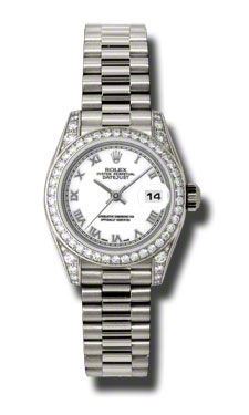 Model: 179159-WHRPR - CASE = [Material:18k White Gold Diamond], [Case Diameter:26], [Bezel:18k White Gold Diamond], [Case Back:Solid], [Water Resistant:100 Meters - 330 Feet], [Crystal:Sapphire], DIAL = [Color:White Roman Numeral], MOVEMENT = [Type:Automatic Self Winding], [Crown:Pull/Push], BAND = [Clasp:Concealed Crown], [Type:18k White Gold President], (Usually ships in 1 to 2 weeks.)