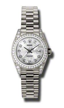 Model: 179159-SIJDPR - CASE = [Material:18k White Gold Diamond], [Case Diameter:26], [Bezel:18k White Gold Diamond], [Case Back:Solid], [Water Resistant:100 Meters - 330 Feet], [Crystal:Sapphire], DIAL = [Color:Silver Jubilee Diamond], MOVEMENT = [Type:Automatic Self Winding], [Crown:Screw Down], BAND = [Clasp:Concealed Crown], [Type:18k White Gold President], (Usually ships in 1 to 2 weeks.)