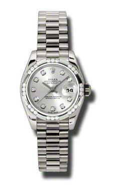 Model: 179369-SIDP - CASE = [Material:18kt White Gold], [Case Diameter:26], [Bezel:Set With 24 Diamonds], [Case Back:Solid], [Water Resistant:100 Meters - 330 Feet], [Crystal:Sapphire], DIAL = [Color:Silver Diamond], MOVEMENT = [Type:Automatic Self Winding], [Crown:Screw Down], BAND = [Clasp:Concealed Crown], [Type:18kt White Gold], (Usually ships in 1 to 2 weeks.)