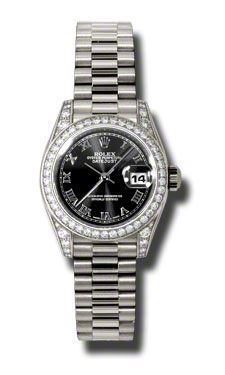 Model: 179159-BKRPR - CASE = [Material:18k White Gold Diamond], [Case Diameter:26], [Bezel:18k White Gold Diamond], [Case Back:Solid], [Water Resistant:100 Meters - 330 Feet], [Crystal:Sapphire], DIAL = [Color:Black Roman Numeral], MOVEMENT = [Type:Automatic Self Winding], [Crown:Screw Down], BAND = [Clasp:Concealed Crown], [Type:18k White Gold President], (Usually ships in 1 to 2 weeks.)