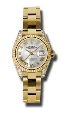 Model: 179238-MOPRO - CASE = [Material:18kt Yellow Gold Set With 24 Diamonds], [Case Diameter:26], [Bezel:Fluted 18kt Yellow Gold], [Case Back:Solid], [Water Resistant:100 Meters - 330 Feet], [Crystal:Sapphire], DIAL = [Color:Mother of Pearl Roman Numeral], MOVEMENT = [Type:Automatic Self Winding], [Crown:Screw Down], BAND = [Clasp:Oysterlock Clasp], [Type:18kt Yellow Gold], (Usually ships in 1 to 2 weeks.)