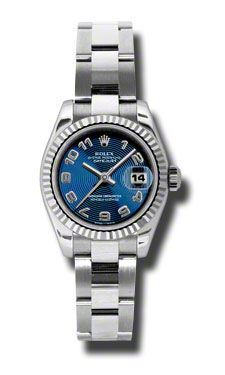 Model: 179174-BLCAO - CASE = [Material:Stainless Steel], [Case Diameter:26], [Bezel:Fluted 18kt White Gold], [Case Back:Solid], [Water Resistant:100 Meters - 330 Feet], [Crystal:Sapphire], DIAL = [Color:Blue Concentric Arabic], MOVEMENT = [Type:Automatic Self Winding], [Crown:Screw Down], BAND = [Clasp:Oysterlock Clasp], [Type:Stainless Steel Oyster], (Usually ships in 1 to 2 weeks.)