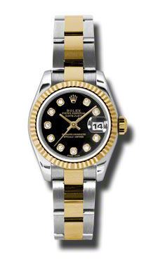 Model: 179173-BKDO - CASE = [Material:Stainless Steel], [Case Diameter:26], [Bezel:Fluted], [Case Back:Solid], [Water Resistant:100 Meters - 330 Feet], [Crystal:Sapphire], DIAL = [Color:Black Diamond], MOVEMENT = [Type:Automatic Self Winding], [Crown:Screw Down], BAND = [Clasp:Oysterlock Clasp], [Type:18kt Yellow Gold and Stainless Steel], (Usually ships in 1 to 2 weeks.)