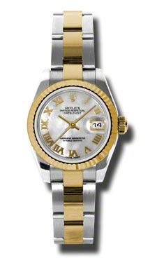 Model: 179173-MOPRO - CASE = [Material:Stainless Steel], [Case Diameter:26], [Bezel:Fluted], [Case Back:Solid], [Water Resistant:100 Meters - 330 Feet], [Crystal:Sapphire], DIAL = [Color:Mother of Pearl Roman Numeral], MOVEMENT = [Type:Automatic Self Winding], [Crown:Screw Down], BAND = [Clasp:Oysterlock Clasp], [Type:18kt Yellow Gold and Stainless Steel], (Usually ships in 1 to 2 weeks.)