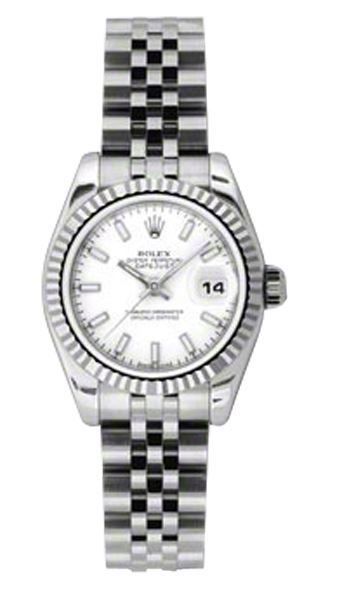 Model: 179174-WHS - CASE = [Material:Stainless Steel], [Case Diameter:26], [Bezel:Fixed Fluted 18kt White Gold], [Case Back:Solid], [Water Resistant:100 Meters - 330 Feet], [Crystal:Scratch Resistant Sapphire], DIAL = [Color:White Index], MOVEMENT = [Type:Automatic Self Winding], [Crown:Screw Down], BAND = [Clasp:Oysterlock Clasp], [Type:Stainless Steel], (Usually ships in 1 to 2 weeks.)