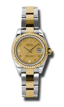 Model: 179173-CHGDMOPDO - CASE = [Material:Stainless Steel], [Case Diameter:26], [Bezel:Fluted 18kt Yellow Gold bezel with 12 diamonds], [Case Back:Solid], [Water Resistant:100 Meters - 330 Feet], [Crystal:Sapphire], DIAL = [Color:Champagne Goldust Mother of Pearl Arabic and Diamond], MOVEMENT = [Type:Automatic Self Winding], [Crown:Screw Down], BAND = [Clasp:Oysterlock Clasp], [Type:18kt Yellow Gold and Stainless Steel], (Usually ships in 1 to 2 weeks.)