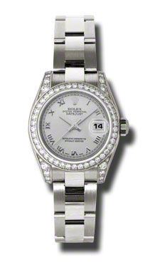 Model: 179159-SIRO - CASE = [Material:18kt White Gold With Diamonds], [Case Diameter:26], [Bezel:Diamonds and 18k White Gold], [Case Back:Solid], [Water Resistant:100 Meters - 330 Feet], [Crystal:Sapphire], DIAL = [Color:Silver Roman Numeral], MOVEMENT = [Type:Automatic Self Winding], [Crown:Screw Down], BAND = [Clasp:Oysterlock Clasp], [Type:18kt White Gold Oyster], (Usually ships in 1 to 2 weeks.)