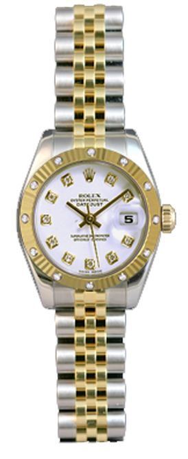 Model: 179313-WHDJ - CASE = [Material:Stainless Steel], [Case Diameter:26], [Bezel:Fluted 18kt Yellow Gold Bezel with 12 Diamonds], [Case Back:Solid], [Water Resistant:100 Meters - 330 Feet], [Crystal:Scratch Resistant Sapphire], DIAL = [Color:White Diamond], MOVEMENT = [Type:Automatic Self Winding], [Crown:Screw Down], BAND = [Clasp:Concealed Crown], [Type:18kt Yellow Gold and Stainless Steel Jubilee], (Usually ships in 1 to 2 weeks.)
