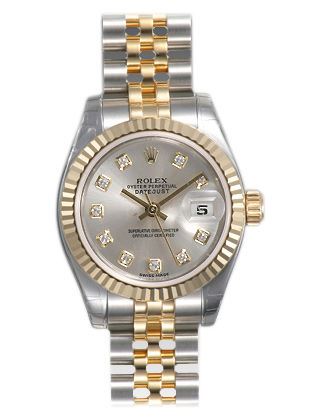 Model: 179173-SIDJ - CASE = [Material:Stainless Steel], [Case Diameter:26], [Bezel:Fixed Fluted], [Water Resistant:100 Meters - 330 Feet], [Crystal:Sapphire], DIAL = [Color:Silver Diamond], MOVEMENT = [Type:31 Jewels Automatic Self Winding], BAND = [Clasp:Hidden Deployant], [Type:18kt Yellow Gold and Stainless Steel Jubilee], (Usually ships in 1 to 2 weeks.)