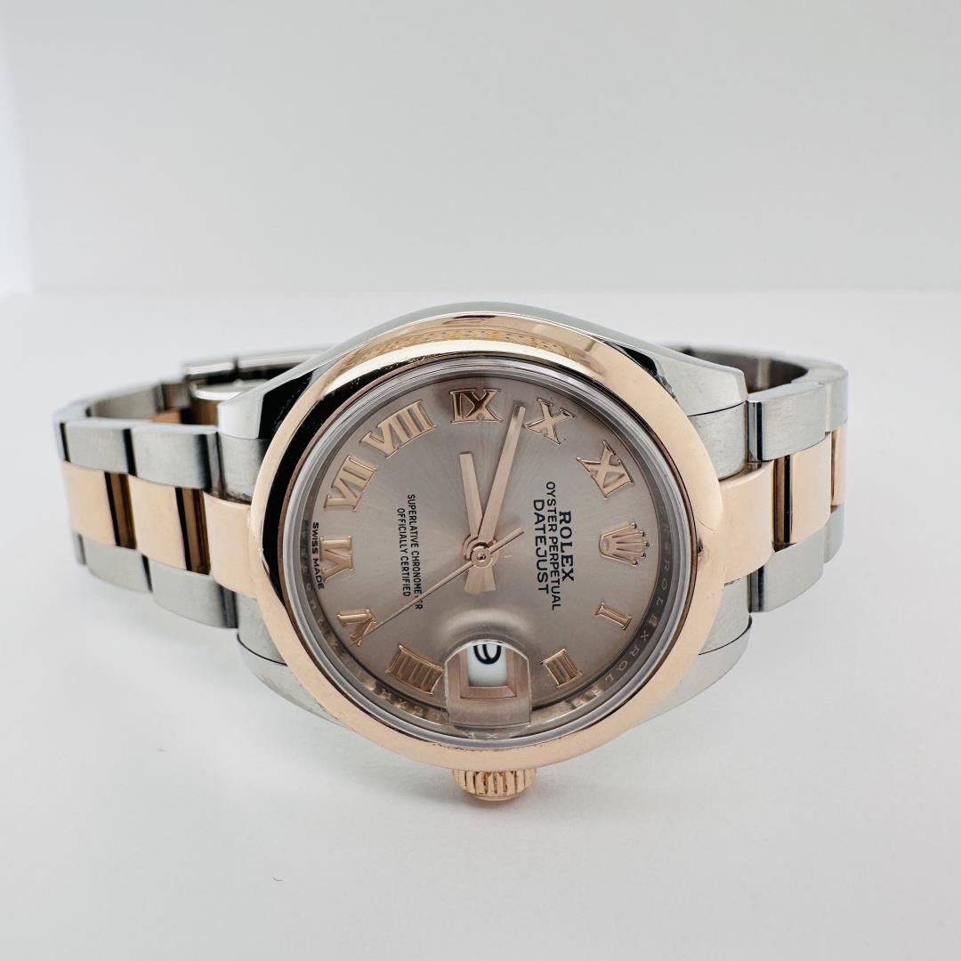 This Rolex Datejust (28mm) is crafted in stainless steel and 18k rose gold, showcasing a refined two-tone design. It features a pink dial with raised Roman numeral hour markers and a date display at 3 o'clock, highlighted by the signature Cyclops lens. Elegant and versatile, this ladies' timepiece embodies modern sophistication with timeless Rolex craftsmanship.