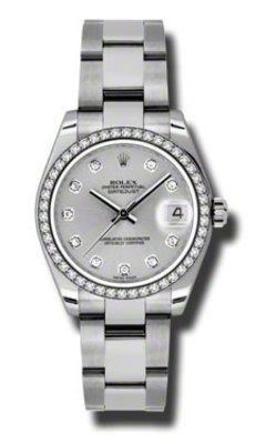 Model: 178384-SLDO - CASE = [Material:Stainless Steel], [Case Diameter:31], [Bezel:46 Diamonds set on 18K White Gold Domed], [Case Back:Solid], [Water Resistant:100 Meters - 330 Feet], [Crystal:Scratch Resistant Sapphire],; DIAL = [Color:Date at 3, Diamond Hour Markers on Silver],; MOVEMENT = [Type:Self Winding Swiss Chronometer], [Crown:Screw Down],; BAND = [Clasp:Oysterclasp], [Type:Oyster], (Usually ships in 2 to 4 business days.)