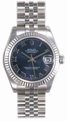 Model: 178274-BLRJ - CASE = [Material:Polished Stainless Steel], [Case Diameter:31], [Bezel:Fluted 18K White Gold], [Case Back:Solid], [Water Resistant:100 Meters - 330 Feet], [Crystal:Scratch Resistant Sapphire],; DIAL = [Color:Roman Numerals, Date at 3 on Blue],; MOVEMENT = [Type:Self Winding Swiss Chronometer], [Crown:Screw Down],; BAND = [Clasp:Concealed Crownclasp], [Type:Jubilee], (Usually ships in 2 to 4 business days.)