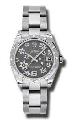 Model: 178344-FLMO - CASE = [Material:Stainless Steel], [Case Diameter:31], [Bezel:24 Diamonds set on 18K White Gold Domed], [Case Back:Solid], [Water Resistant:100 Meters - 330 Feet], [Crystal:Scratch Resistant Sapphire],; DIAL = [Color:Dark Rhodium Floral Motif],; MOVEMENT = [Type:Self Winding Swiss Chronometer], [Crown:Screw Down],; BAND = [Clasp:Oysterlock], [Type:Oyster], (Usually ships in 2 to 4 business days.)