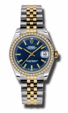 Model: 178383-BLSJ - CASE = [Material:Stainless Steel and 18kt Yellow Gold], [Case Diameter:31], [Bezel:18kt yellow gold set with 46 Diamond], [Case Back:Solid], [Water Resistant:100 Meters - 330 Feet], [Crystal:Sapphire],; DIAL = [Color:Blue Index],; MOVEMENT = [Type:Automatic Self Winding], [Crown:Screw Down],; BAND = [Clasp:Concealed Crown], [Type:18kt Yellow Gold and Stainless Steel Jubilee], (Usually ships in 1 to 2 weeks.)