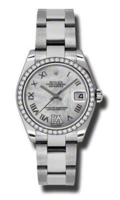 Model: 178384-MPRD6O - CASE = [Material:Stainless Steel], [Case Diameter:31], [Bezel:46 Diamonds set on 18K White Gold Domed], [Case Back:Solid], [Water Resistant:100 Meters - 330 Feet], [Crystal:Scratch Resistant Sapphire],; DIAL = [Color:Date at 3, Roman Numeral Hour Markers 11 Diamonds at VI on Mother of Pearl],; MOVEMENT = [Type:Self Winding Swiss Chronometer], [Crown:Screw Down],; BAND = [Clasp:Oysterclasp], [Type:Oyster], (Usually ships in 2 to 4 business days.)