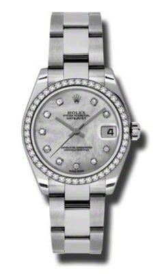 Model: 178384-MPDO - CASE = [Material:Stainless Steel], [Case Diameter:31], [Bezel:46 Diamonds set on 18K White Gold Domed], [Case Back:Solid], [Water Resistant:100 Meters - 330 Feet], [Crystal:Scratch Resistant Sapphire],; DIAL = [Color:Date at 3, Diamond Hour Markers on Motherof pearl],; MOVEMENT = [Type:Self Winding Swiss Chronometer], [Crown:Screw Down],; BAND = [Clasp:Oysterclasp], [Type:Oyster], (Usually ships in 2 to 4 business days.)