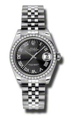 Model: 178384-BKSBRJ - CASE = [Material:Stainless Steel], [Case Diameter:31], [Bezel:46 Diamonds set on 18K White Gold Domed], [Case Back:Solid], [Water Resistant:100 Meters - 330 Feet], [Crystal:Scratch Resistant Sapphire],; DIAL = [Color:Date at 3, Roman Numeral Hour Markers on Black Sunbeam],; MOVEMENT = [Type:Self Winding Swiss Chronometer], [Crown:Screw Down],; BAND = [Clasp:Concealed Crownclasp], [Type:Jubilee], (Usually ships in 2 to 4 business days.)
