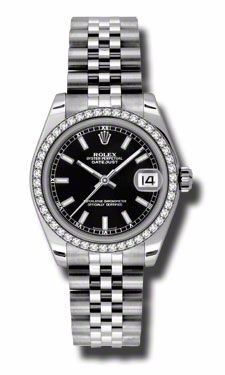 Model: 178384-BKSJ - CASE = [Material:Stainless Steel], [Case Diameter:31], [Bezel:Fixed 18kt White Gold Bezel Set with 46 Diamonds], [Case Back:Solid], [Water Resistant:100 Meters - 330 Feet], [Crystal:Scratch Resistant Sapphire],; DIAL = [Color:Black Stick],; MOVEMENT = [Type:Automatic Self Winding], [Crown:Screw Down],; BAND = [Clasp:Concealed Crown], [Type:Stainless Steel Jubilee], (Usually ships in 1 to 2 weeks.)