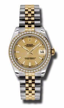 Model: 178383-CHSJ - CASE = [Material:Stainless Steel and 18kt Yellow Gold], [Case Diameter:31], [Bezel:18kt yellow gold set with 46 Diamond], [Case Back:Solid], [Water Resistant:100 Meters - 330 Feet], [Crystal:Sapphire],; DIAL = [Color:Champagne Index],; MOVEMENT = [Type:Automatic Self Winding], [Crown:Screw Down],; BAND = [Clasp:Concealed Crown], [Type:18kt Yellow Gold and Stainless Steel Jubilee], (Usually ships in 1 to 2 weeks.)