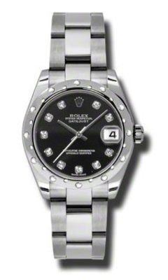 Model: 178344-BKDO - CASE = [Material:Stainless Steel], [Case Diameter:31], [Bezel:24 Diamonds set on 18K White Gold Domed], [Case Back:Solid], [Water Resistant:100 Meters - 330 Feet], [Crystal:Scratch Resistant Sapphire],; DIAL = [Color:Date at 3 and Diamond Hour Markers on Black],; MOVEMENT = [Type:Self Winding Swiss Chronometer], [Crown:Screw Down],; BAND = [Clasp:Oysterlock], [Type:Oyster], (Usually ships in 2 to 4 business days.)