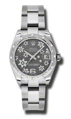 Model: 178344-FLMO - CASE = [Material:Stainless Steel], [Case Diameter:31], [Bezel:24 Diamonds set on 18K White Gold Domed], [Case Back:Solid], [Water Resistant:100 Meters - 330 Feet], [Crystal:Scratch Resistant Sapphire], DIAL = [Color:Dark Rhodium Floral Motif], MOVEMENT = [Type:Self Winding Swiss Chronometer], [Crown:Screw Down], BAND = [Clasp:Oysterlock], [Type:Oyster], (Usually ships in 2 to 4 business days.)