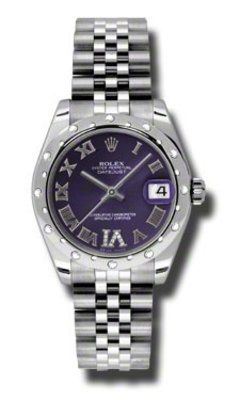 Model: 178344-PRD6 - CASE = [Material:Stainless Steel], [Case Diameter:31], [Bezel:24 Diamonds set on 18K White Gold Domed], [Case Back:Solid], [Water Resistant:100 Meters - 330 Feet], [Crystal:Scratch Resistant Sapphire], DIAL = [Color:Date at 3, Roman Numeral Hour Markers and 11 Diamonds at VI on Mother of Purple], MOVEMENT = [Type:Self Winding], [Crown:Screw Down], BAND = [Clasp:Concealed Crownclasp], [Type:Jubilee], (Usually ships in 2 to 4 business days.)