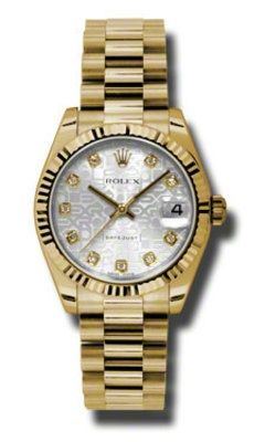 Model: 178278-SJD - CASE = [Material:18K Yellow Gold], [Case Diameter:31], [Bezel:Fluted], [Case Back:Solid], [Water Resistant:100 Meters - 330 Feet], [Crystal:Scratch Resistant Sapphire], DIAL = [Color:Date at 3 and Diamond Markers on silver jubilee], MOVEMENT = [Type:Self Winding], [Crown:Screw Down], BAND = [Clasp:Concealed Crownclasp], [Type:18K Gold President], (Usually ships in 2 to 4 business days.)