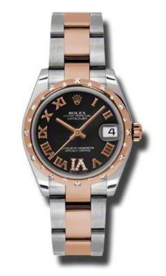 Model: 178341-BKRO - CASE = [Material:Stainless Steel and 18K Rose Gold], [Case Diameter:31], [Bezel:26 Diamonds set in 18K Rose Gold Domed], [Case Back:Solid], [Water Resistant:100 Meters - 330 Feet], [Crystal:Scratch Resistant Sapphire], DIAL = [Color:Roman Numerals and VI set with 11 Diamonds Date at 3 on Black], MOVEMENT = [Type:Self Winding Swiss Chronometer], [Crown:Screw Down], BAND = [Clasp:Oysterclasp with Easylink Comfort Extension Link], [Type:Steel and 18k Rose Gold Oyster], (Usually ships in 2 to 4 business days.)