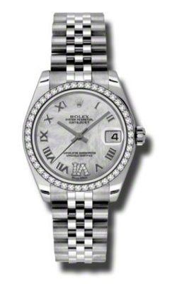 Model: 178384-MPRD6J - CASE = [Material:Stainless Steel], [Case Diameter:31], [Bezel:46 Diamonds set on 18K White Gold Domed], [Case Back:Solid], [Water Resistant:100 Meters - 330 Feet], [Crystal:Scratch Resistant Sapphire], DIAL = [Color:Date at 3, Roman Numeral Hour Markers 11 Diamonds at VI on Mother of Pearl], MOVEMENT = [Type:Self Winding Swiss Chronometer], [Crown:Screw Down], BAND = [Clasp:Concealed Crownclasp], [Type:Jubilee], (Usually ships in 2 to 4 business days.)