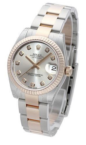 Model: 178271-0030 - CASE = [Material:Stainless Steel], [Case Diameter:31], [Bezel:Fluted 18kt Rose Gold], [Case Back:Solid], [Water Resistant:100 Meters - 330 Feet], [Crystal:Scratch Resistant Sapphire], DIAL = [Color:Silver with Diamonds and Date at 3], MOVEMENT = [Type:Automatic Self Winding], [Crown:Screw Down], BAND = [Clasp:Concealed Crown], [Type:18kt Rose Gold and Stainless Steel], (In Stock - Ready to ship.)