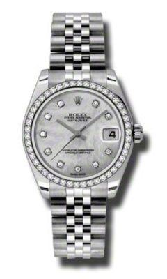 Model: 178384-MPDJ - CASE = [Material:Stainless Steel], [Case Diameter:31], [Bezel:46 Diamonds set on 18K White Gold Domed], [Case Back:Solid], [Water Resistant:100 Meters - 330 Feet], [Crystal:Scratch Resistant Sapphire], DIAL = [Color:Date at 3, Diamond Hour Markers on Motherof pearl], MOVEMENT = [Type:Self Winding Swiss Chronometer], [Crown:Screw Down], BAND = [Clasp:Concealed Crownclasp], [Type:Jubilee], (Usually ships in 2 to 4 business days.)