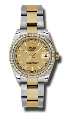 Model: 178383-CHSO - CASE = [Material:Stainless Steel and 18kt Yellow Gold], [Case Diameter:31], [Bezel:18kt yellow gold set with 46 Diamond], [Case Back:Solid], [Water Resistant:100 Meters - 330 Feet], [Crystal:Sapphire], DIAL = [Color:Champagne Index], MOVEMENT = [Type:Automatic Self Winding], [Crown:Screw Down], BAND = [Clasp:Oysterlock Clasp], [Type:18kt Yellow Gold and Stainless Steel], (Usually ships in 1 to 2 weeks.)