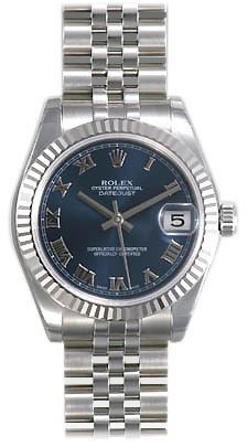 Model: 178274-BLRJ - CASE = [Material:Polished Stainless Steel], [Case Diameter:31], [Bezel:Fluted 18K White Gold], [Case Back:Solid], [Water Resistant:100 Meters - 330 Feet], [Crystal:Scratch Resistant Sapphire], DIAL = [Color:Roman Numerals, Date at 3 on Blue], MOVEMENT = [Type:Self Winding Swiss Chronometer], [Crown:Screw Down], BAND = [Clasp:Concealed Crownclasp], [Type:Jubilee], (Usually ships in 2 to 4 business days.)