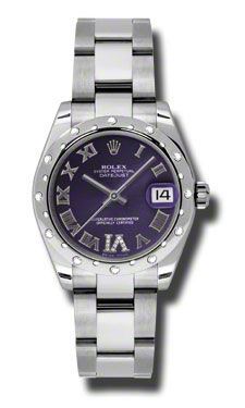 Model: 178344-PURO - CASE = [Material:Stainless Steel], [Case Diameter:31], [Bezel:18kt white gold domed bezel set with 24 diamonds], [Case Back:Solid], [Water Resistant:100 Meters - 330 Feet], [Crystal:Scratch Resistant Sapphire], DIAL = [Color:Purple Roman Numeral], MOVEMENT = [Type:Automatic Self Winding], [Crown:Screw Down], BAND = [Clasp:Oysterlock Clasp], [Type:Stainless Steel Oyster], (Usually ships in 2 to 4 business days.)