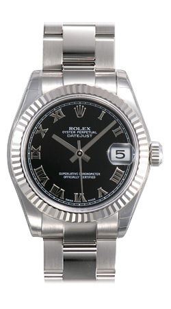 Model: 178274-BKRO - CASE = [Material:Polished Stainless Steel], [Case Diameter:31], [Bezel:Fluted 18K White Gold], [Case Back:Solid], [Water Resistant:100 Meters - 330 Feet], [Crystal:Scratch Resistant Sapphire], DIAL = [Color:Roman Numerals, Date at 3 on Black], MOVEMENT = [Type:Self Winding Swiss Chronometer], [Crown:Screw Down], BAND = [Clasp:Oysterclasp with Easylink Comfort Extension Link], [Type:Oyster], (Usually ships in 2 to 4 business days.)