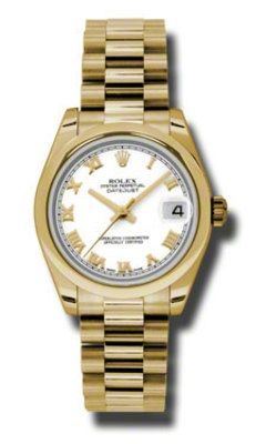 Model: 178248-WHR - CASE = [Material:18K Yellow Gold], [Case Diameter:31], [Bezel:Domed], [Case Back:Solid], [Water Resistant:100 Meters - 330 Feet], [Crystal:Scratch Resistant Sapphire], DIAL = [Color:Date at 3 and Roman Numeral Markers on White], MOVEMENT = [Type:Self Winding], [Crown:Screw Down], BAND = [Clasp:Concealed Crownclasp], [Type:18K Gold President], (Usually ships in 2 to 4 business days.)