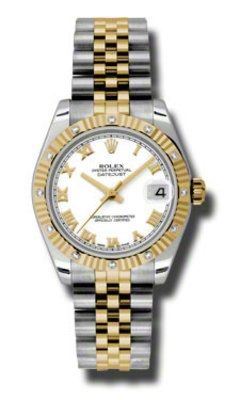 Model: 178313-WHRJ - CASE = [Material:Stainless Steel and 18K Yellow Gold], [Case Diameter:31], [Bezel:12 Diamonds Set in 18K Yellow Gold Fluted], [Case Back:Solid], [Water Resistant:100 Meters - 330 Feet], [Crystal:Scratch Resistant Sapphire], DIAL = [Color:Roman Numeral Hour Markers, Date at 3 on White], MOVEMENT = [Type:Self Winding Swiss Chronometer], [Crown:Screw Down], BAND = [Clasp:Concealed Crownclasp], [Type:Steel and 18k Yellow Gold Jubilee], (Usually ships in 2 to 4 business days.)