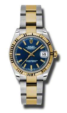 Model: 178273-BLSO - CASE = [Material:Stainless Steel], [Case Diameter:31], [Bezel:Fluted], [Case Back:Solid], [Water Resistant:100 Meters - 330 Feet], [Crystal:Sapphire], DIAL = [Color:Blue Index], MOVEMENT = [Type:Automatic Self Winding], [Crown:Screw Down], BAND = [Clasp:Oysterlock Clasp], [Type:18kt Yellow Gold and Stainless Steel], (Usually ships in 1 to 2 weeks.)
