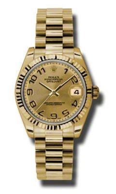 Model: 178278-CHA - CASE = [Material:18K Yellow Gold], [Case Diameter:31], [Bezel:Fluted], [Case Back:Solid], [Water Resistant:100 Meters - 330 Feet], [Crystal:Scratch Resistant Sapphire], DIAL = [Color:Date and Arabic Numerals on Champagne Concentric Circle], MOVEMENT = [Type:Self Winding], [Crown:Screw Down], BAND = [Clasp:Concealed Crownclasp], [Type:18K Gold President], (Usually ships in 2 to 4 business days.)