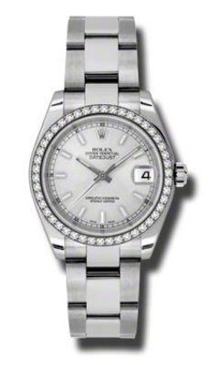 Model: 178384-SLIO - CASE = [Material:Stainless Steel], [Case Diameter:31], [Bezel:46 Diamonds set on 18K White Gold Domed], [Case Back:Solid], [Water Resistant:100 Meters - 330 Feet], [Crystal:Scratch Resistant Sapphire], DIAL = [Color:Date at 3, Index Hour Markers on Silver], MOVEMENT = [Type:Self Winding Swiss Chronometer], [Crown:Screw Down], BAND = [Clasp:Oysterclasp], [Type:Oyster], (Usually ships in 2 to 4 business days.)