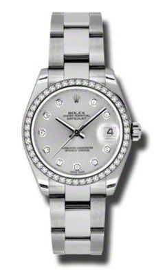 Model: 178384-SLDO - CASE = [Material:Stainless Steel], [Case Diameter:31], [Bezel:46 Diamonds set on 18K White Gold Domed], [Case Back:Solid], [Water Resistant:100 Meters - 330 Feet], [Crystal:Scratch Resistant Sapphire], DIAL = [Color:Date at 3, Diamond Hour Markers on Silver], MOVEMENT = [Type:Self Winding Swiss Chronometer], [Crown:Screw Down], BAND = [Clasp:Oysterclasp], [Type:Oyster], (Usually ships in 2 to 4 business days.)