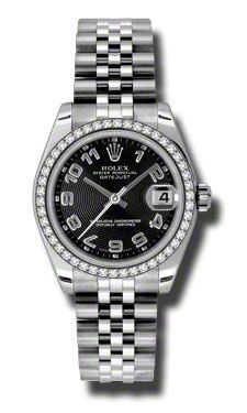 Model: 178384-BADJ - CASE = [Material:Stainless Steel], [Case Diameter:31], [Bezel:46 Diamonds set on 18K White Gold Domed], [Case Back:Solid], [Water Resistant:100 Meters - 330 Feet], [Crystal:Scratch Resistant Sapphire], DIAL = [Color:Date at 3, Arabic Numerals on Black Concentric], MOVEMENT = [Type:Self Winding Swiss Chronometer], [Crown:Screw Down], BAND = [Clasp:Concealed Crownclasp], [Type:Jubilee], (Usually ships in 2 to 4 business days.)