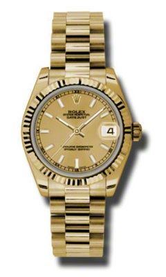 Model: 178278-CHI - CASE = [Material:18K Yellow Gold], [Case Diameter:31], [Bezel:Fluted], [Case Back:Solid], [Water Resistant:100 Meters - 330 Feet], [Crystal:Scratch Resistant Sapphire], DIAL = [Color:Date and Index Markers Champagne], MOVEMENT = [Type:Self Winding], [Crown:Screw Down], BAND = [Clasp:Concealed Crownclasp], [Type:18K Gold President], (Usually ships in 2 to 4 business days.)